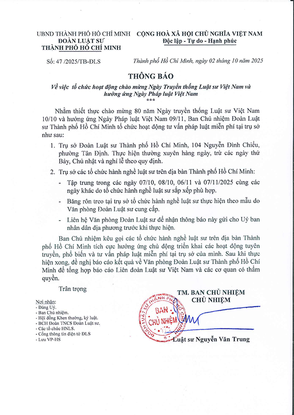 THÔNG BÁO Về việc tổ chức hoạt động chào mừng Ngày Truyền thống Luật sư Việt Nam và hưởng ứng Ngày Pháp luật Việt Nam