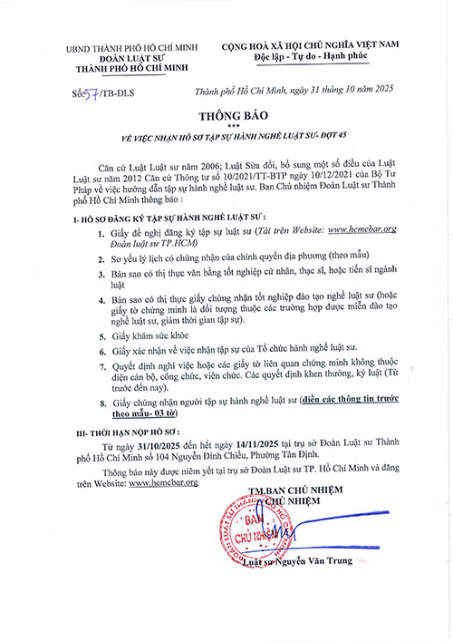 THÔNG BÁO VỀ VIỆC NHẬN HỒ SƠ TẬP SỰ HÀNH NGHỀ LUẬT SƯ- ĐỢT 45