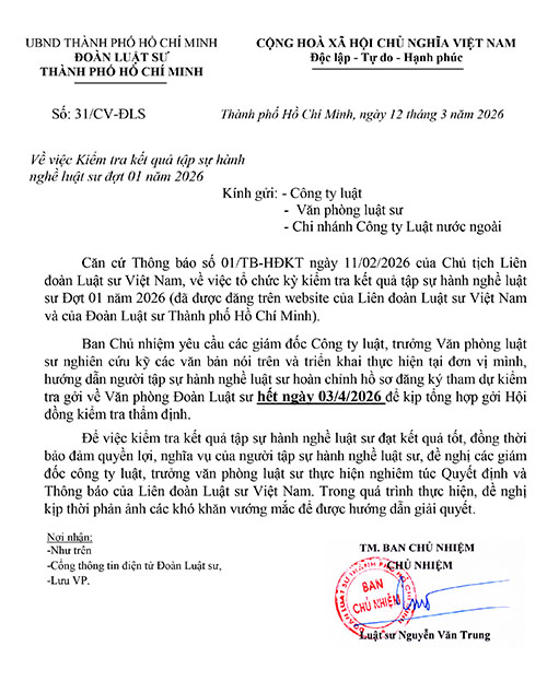 VỀ VIỆC KIỂM TRA KẾT QUẢ TẬP SỰ HÀNH NGHỀ LUẬT SƯ ĐỢT 01 NĂM 2026