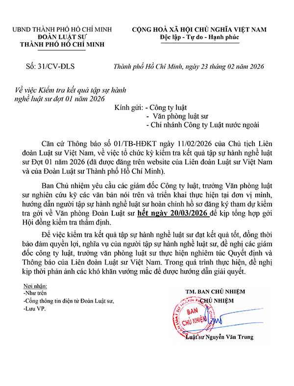 Về việc Kiểm tra kết quả tập sự hành nghề luật sư đợt 01 năm 2026