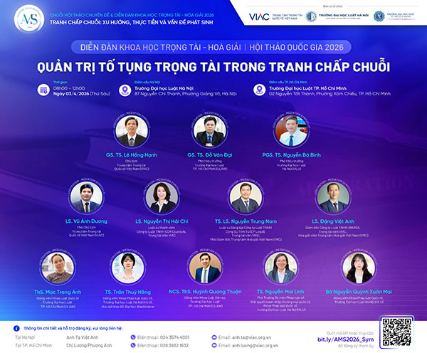 Diễn đàn Khoa học về Trọng tài - Hòa giải – Hội thảo Quốc gia 2026 được tổ chức bởi Trung tâm Trọng tài Quốc tế Việt Nam, Trường Đại học Luật TP. Hồ Chí Minh và Trường Đại học Luật Hà Nội là sự kiện trọng điểm trong khuôn khổ chuỗi hoạt động AMS 2026. Diễn đàn hướng tới định vị cách hiểu và giải pháp quản trị tranh chấp dạng chuỗi trong khung pháp lý và thực tiễn trọng tài tại Việt Nam. Trên cơ sở đó, Diễn đàn sẽ đi sâu, làm rõ điểm tương đồng, khác biệt so với cách tiếp cận quốc tế; phân tích thực tiễn tố tụng trong các chuỗi tranh chấp thuộc lĩnh vực bất động sản – xây dựng, tài chính, thương mại và khuyến nghị một số giải pháp có thể vận dụng trong bối cảnh pháp luật hiện hành. Xa hơn, Diễn đàn cũng đặt ra vấn đề về sự cần thiết của việc xây dựng cơ chế riêng cho tranh chấp dạng chuỗi, qua đó làm cơ sở cho những cân nhắc sửa đổi, hoàn thiện pháp luật trọng tài trong tương lai.