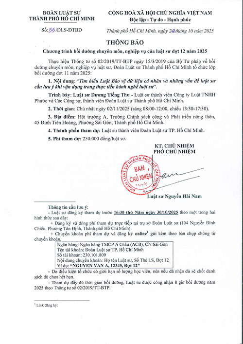 THÔNG BÁO CHƯƠNG TRÌNH BỒI DƯỠNG CHUYÊN MÔN, NGHIỆP VỤ CỦA LUẬT SƯ ĐỢT 12 NĂM 2025