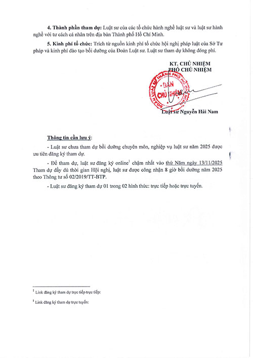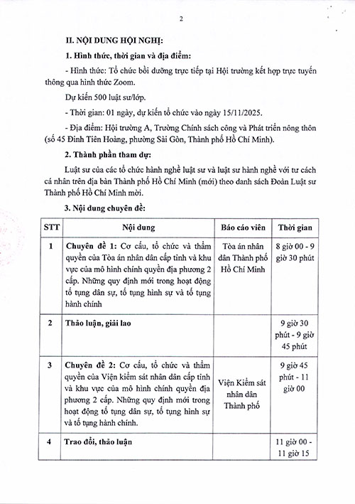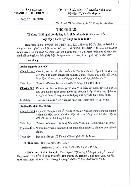 THÔNG BÁO TỔ CHỨC “HỘI NGHỊ BỒI DƯỠNG KIẾN THỨC PHÁP LUẬT LIÊN QUAN ĐẾN HOẠT ĐỘNG HÀNH NGHỀ LUẬT SƯ NĂM 2025”