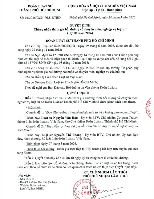 QUYẾT ĐỊNH CHỨNG NHẬN THAM GIA BỒI DƯỠNG VỀ CHUYÊN MÔN, NGHIỆP VỤ CỦA LUẬT SƯ NGÀY ĐỢT 01- NGÀY 07-03-2026